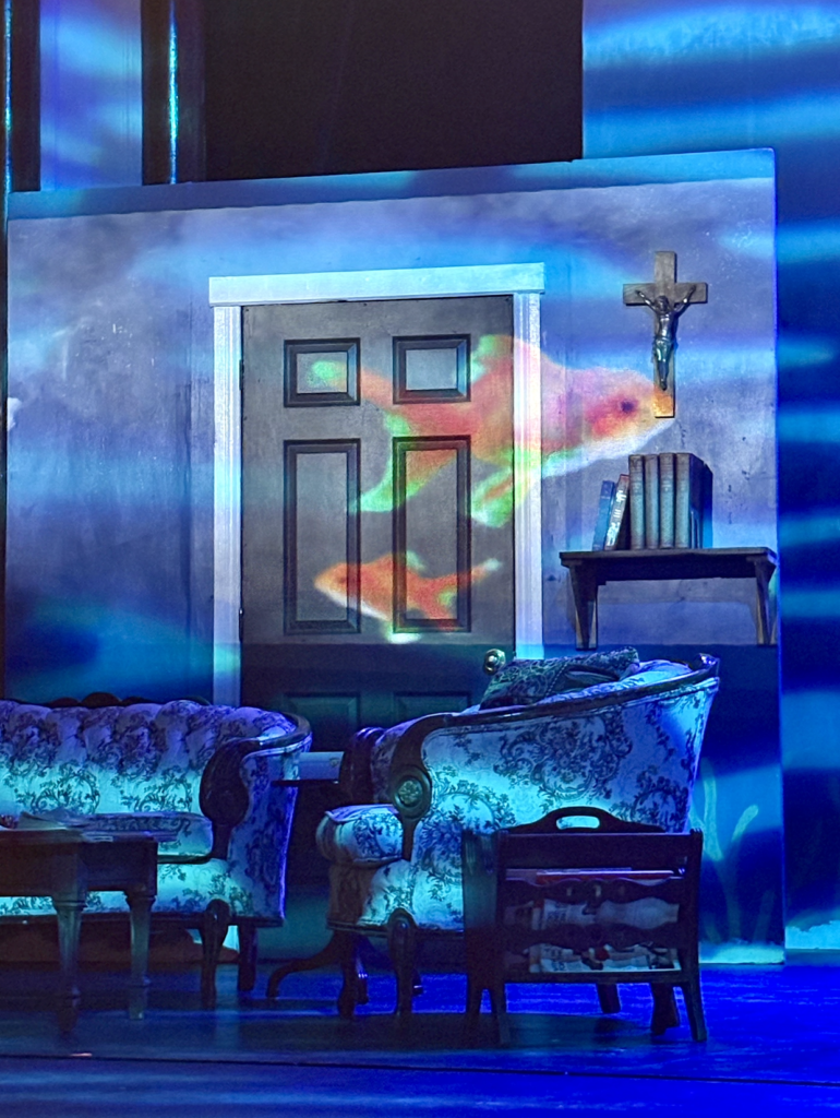 The theatre in Memorial Hall featured awe-inspiring visuals and set design. The background had an ocean-esque gradient painted on the walls, and holographic goldfishes swimming across the stage. The smaller pieces filling in the background added to the verisimilitude of the show; all the biblical imagery around the house is imperative to the characters’ world since Iris’ family is religious and she goes to a Catholic school.