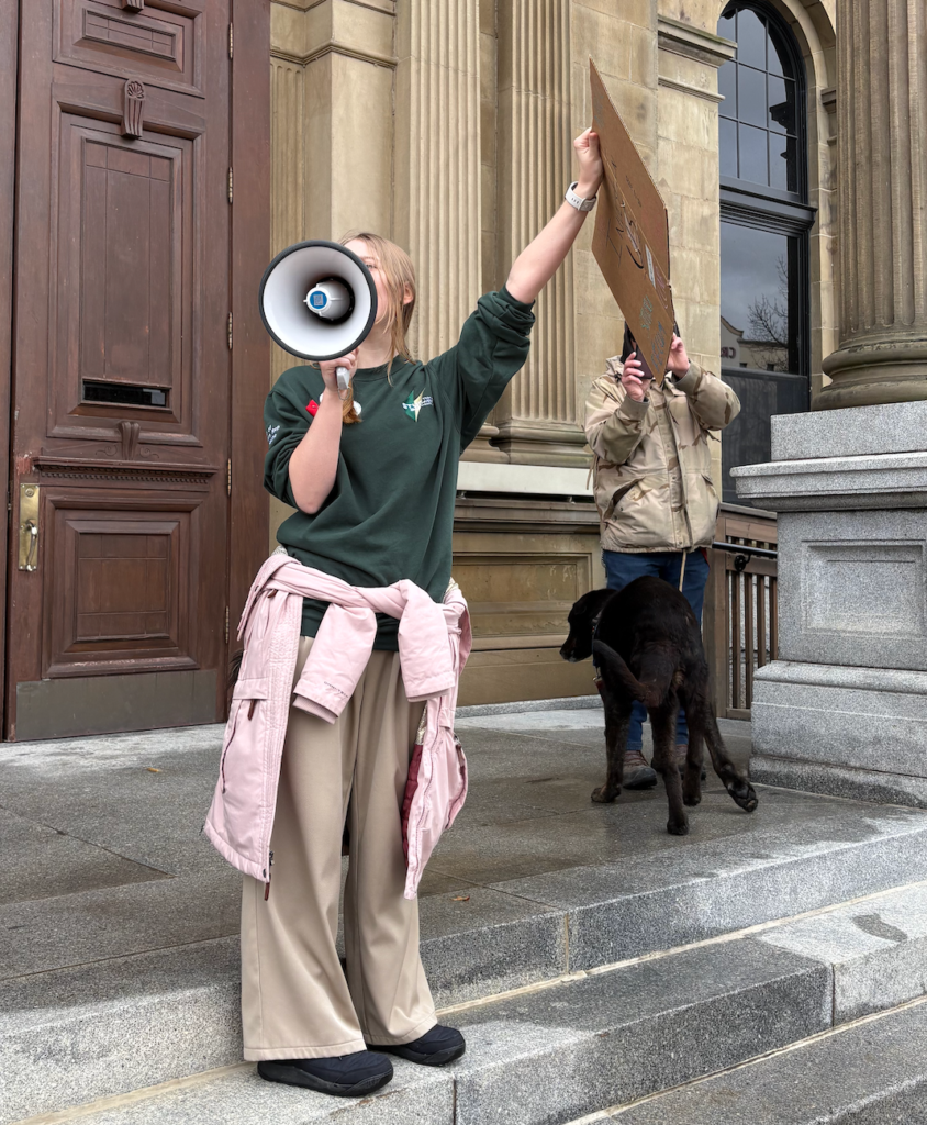 As time passed, some noticeable faces began to appear within the crowd outside the Legislature, namely NB Green Party leader David Coon. He voiced his concerns regarding the proposed cuts and their potential consequences; he also encouraged the younger generations to continue the conversation and never give up the fight for a better future.