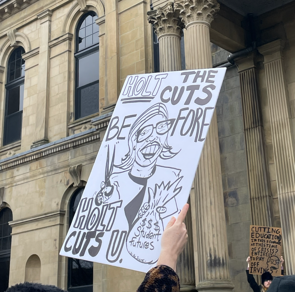On March 17th 2026, over 1000 students from UNB, St. Thomas University, Mount Allison University, Université de Moncton, and NBCCD (New Brunswick College of Craft and Design) gathered at the Fredericton Legislative Assembly to protest the Holt administration’s proposed $35–50 million budget cut to post-secondary education. The protest occurred simultaneously with the administration’s decision on the final budget. The protest began at 10 a.m., lasting around five hours. UNB student Islay Hayward organized the event along with all the New Brunswick university student unions, except the UNBSU.