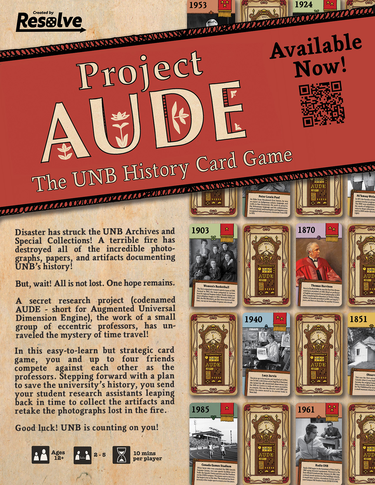 Fredericton, New Brunswick, 22 of January, 2025 — Resolve, an applied game design research group at UNB, releases their new game, Project AUDE: The UNB History Card Game.